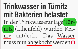 Verunreinigt Kürnberg: Trinkwasser muss abgekocht werden. Seit 15. Juni heißt es in Kürnberg Wasser abkochen. Die Gemeinde wurde vom Trinkwasserunter-suchungslabor verständigt, das die letzten Wasserproben coliforme Bakterien und Enterokokken aufweisen und deshalb nicht den strengen Richtwerten der Trinkwasserver-ordnung entsprechen NÖN.at 26. 6. 18 |