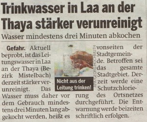 Lanzenkirchen Trinkwasser verunreinigt: Suche nach Ursachen In Frohsdorf wurden auffällige Werte gefunden, Wasser muss abgekocht werden. Gestern, Montag, wurde die Gemeinde vom Trinkwasseruntersuchungslabor darüber verständigt, dass bei den jüngsten Proben Coliforme Bakterien und Ecoli (kann Durchfallerkrankungen auslösen) im Frohsdorfer Trinkwasser nachgewiesen wurden. NÖN.at 9. 10. 2018 |